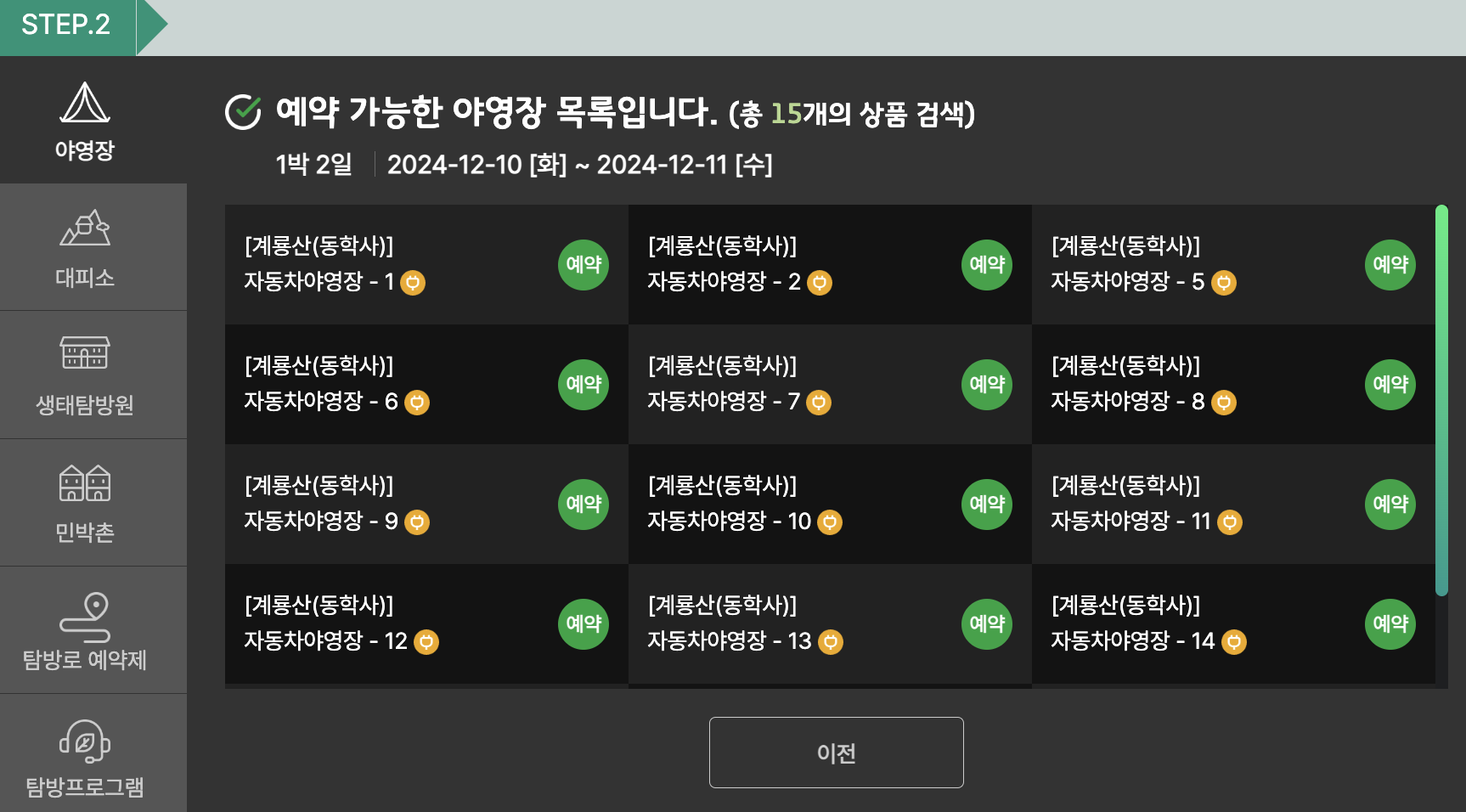 국립공원 야영장은 오직 국립공원 관리공단 예약시스템에서만 예약이 가능합니다.
