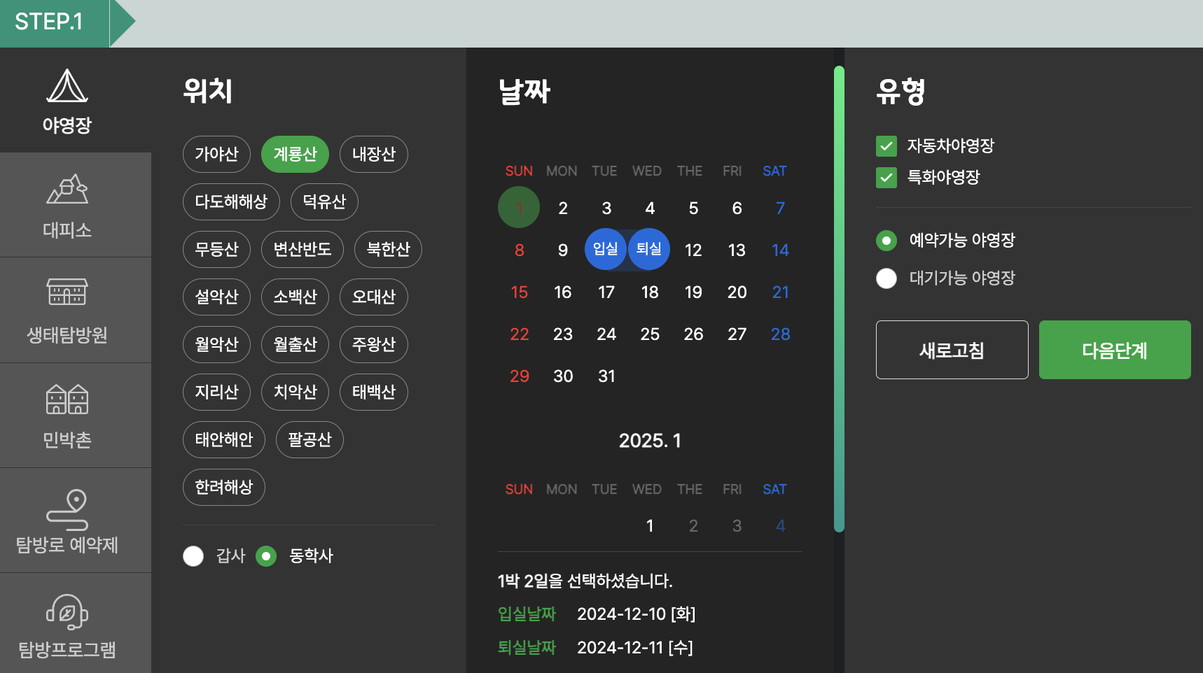 야영장마다 예약 일정이 다르기 때문에, 국립공원 관리공단 예약시스템에서 예약 일정을 확인하시기 바랍니다.
