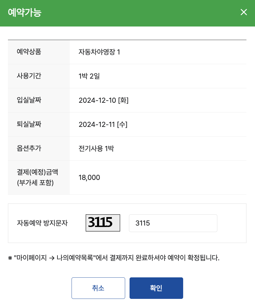 - 위의 실제 예약 화면 두 번째 이미지를 보시면, 야영장 사이트를 선택하고 예약을 진행할 수 있습니다.